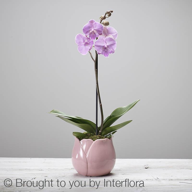 The gift that keeps on giving, Orchids love a bright spot in the home or office and bloom most of the year with a little love and watering. Beautifully presented in our pink tulip ceramic pot for the perfect finishing touch.
