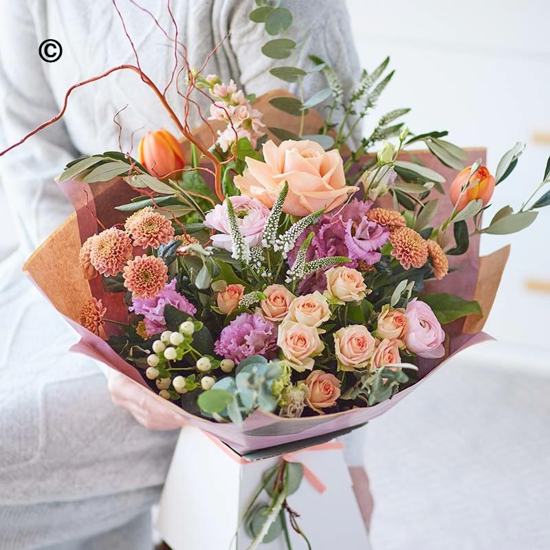 A gorgeous spring bouquet in a stunning modern style It'll feature seasonal blooms in apricot, peach, lemon and cream tones, plus dried flowers and grasses. The larger size will include extra blooms or extra unusual ones. And of course, there's not a single lily in sight.